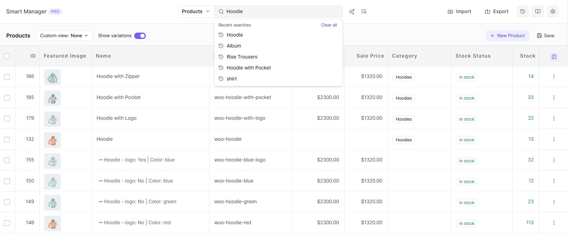 However, without exact keyword, Smart Manager will match all records that have any of those keywords. For example, if you search ‘Hoodie’, then Smart Manager will display all those records containing ‘Hoodie’.